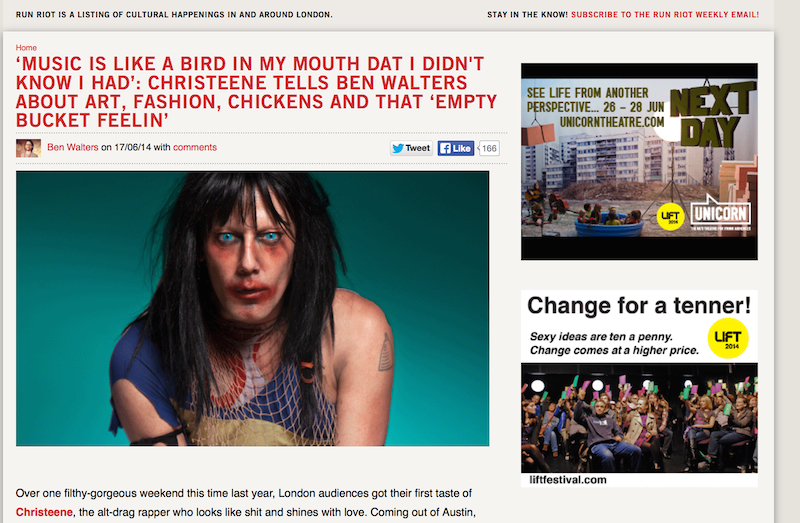 I love a bit of Christeene. I flagged up her bravura flying visit to London in my round-up of cabaret highlights of 2013, and now she’s back in a big way, hitting Soho Theatre and Duckie’s Gay Shame ahead of a full Edinburgh run. This Q&A for Run-Riot is probably my favourite email interview that I’ve done yet.