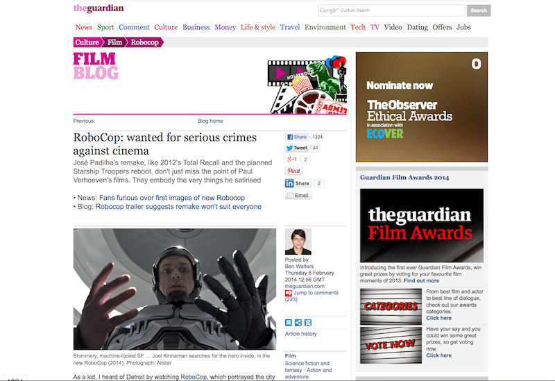 It was a pleasure and almost a duty, then, to write this piece for the Guardian in response to the new remake of RoboCop, which I saw on Tuesday. It’s not an atrocious movie – not as bad as the 2012 remake of Total Recall, for instance – but it sure ain’t good. My piece is about how (in the well-chosen words of Guardian subeditors) the remakes of his classic SF actioners “don’t just miss the point of Paul Verhoeven’s films. They embody the things he satirised”.