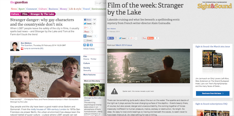 Stranger by the Lake coverageJust a little heads up about a couple of pieces I wrote related to Alain Guiraudie’s terrific, unsettling thriller Stranger by the Lake, a naturalistic and intoxicating tale of sex and murder  at a French lakeside cruising spot that was released in the UK this weekend.